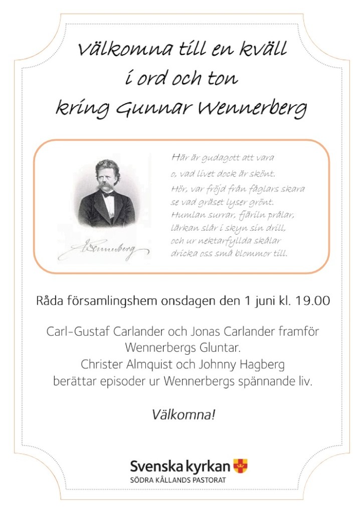 För er som inte tycker att ni har så bra kunskap om Gunnar Wennerberg så har vi en presentation av Wennerbergs liv i Råda församlingshem nu på onsdag den 1 juni kl 19.00. Wennerbergkännaren Johnny Hagberg och jag kommer att presentera axplock ur GWs liv och gärningar.